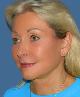 In einem zweiten Eingriff wurden ein PRESTO-Facelift und ein Halslift kombiniert, um die Konturen im unteren Gesicht und am Hals erneut zu straffen. Zusätzlich erfolgte eine Bullhornplastik zur dezenten Verkürzung des Philtrums und Betonung der Oberlippe. Feine Volumenverluste im Mittelgesicht und an den Wangen wurden mit körpereigenem Fett sanft ausgeglichen. Das Ergebnis: ein sichtbar frischeres Erscheinungsbild – ohne den Charakter des Gesichts zu verändern.