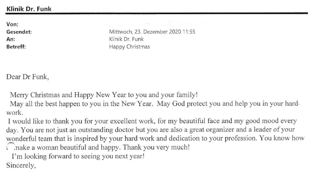 Nach Vorlage meiner Photos, wie ich mit 40 Jahren aussah, konnte genau dieser Ausdruck wieder “zurückgezaubert” werden, nun sehe ich so aus, wie ich mich fühle, nämlich gut.”